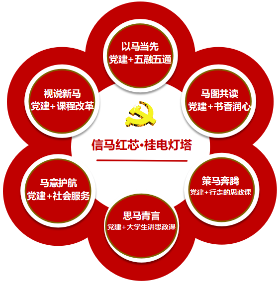 遵循“在马言马”理念,结合各教研室党支部的专业特点,重点培育6个教师党支部“一支部一品牌”,形成了具有桂电马院特色的“信马红芯•桂电灯塔”党建品牌矩阵。