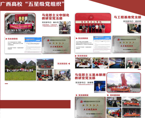 近五年来,学院年终党建考核均为“优秀”,两次获得“大党建单项奖”,先后获自治区先进基层党组织、广西高校先进基层党组织、学校先进基层党组织等荣誉称号。2023年顺利通过首批新时代广西高校党建工作标杆院系验收,同年获评第二批全区“三全育人”综合改革示范院系(A类)。现有自治区“五星级”党支部3个,“四星级”党支部1个,“三星级”党支部2个,其中获评广西高校“双带头人”教师党支部书记工作室2个,校级“双带头人”教师党支部书记工作室2个。荣获首批广西高校示范党建品牌和党建创新典型案例各1个,2个支部入选自治区“双带头人”教师党支部“强国行”专项行动。学院党建工作典型经验被《中国教育报》、广西卫视《八桂之窗》、《当代广西》等主流媒体宣传报道。