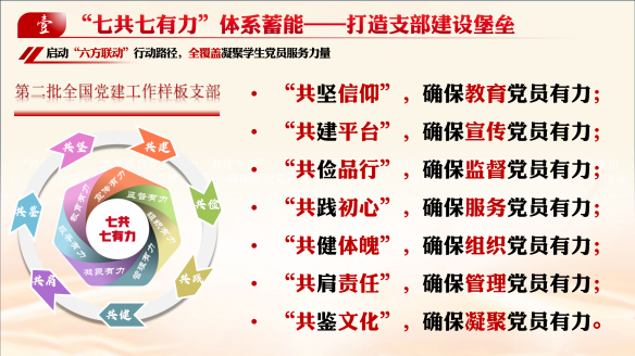 6、“共肩责任”,管理党员有力:实施党员目标管理和积分考核制度。将党员参与理论学习、组织生活、志愿服务、作用发挥等情况量化,定期公示,作为评优评先的重要依据。设立“党员责任区”,在宿舍、课堂、实验室等明确党员职责,引导党员在日常学习生活中亮身份、作表率、担责任。