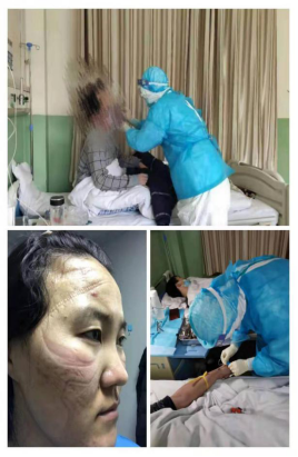 宁夏回族自治区第四人民医院收治的全部是新型冠状病毒肺炎疫情的确诊患者。由于我院医疗队员业务素质强被安排到确诊病房和负压病房工作,直接负责救治确诊患者。在确诊病房中,为了节约一次性防护服的用量,医疗队队员在“全副武装”前都会尽量少喝水、少吃东西,工作时医疗队员全部都是穿着尿不湿上班。12小时一次轮班,也就是说12个小时内医疗队员们不能喝水、不能吃东西、不能上厕所。医疗队员们经常连续奋战12个小时走出隔离区,脱下防护服才发觉汗水已经浸透了衣服。穿着防护服里面的衣服每一次被汗水浸湿,脸上也会被口罩护目镜勒出深深的痕迹。工作一天下来,摘下口罩,队员们的脸颊和耳朵“千疮百孔”、伤痕累累,腿脚也跑肿了,有的队员痛风发作任然坚持上班,不下火线。